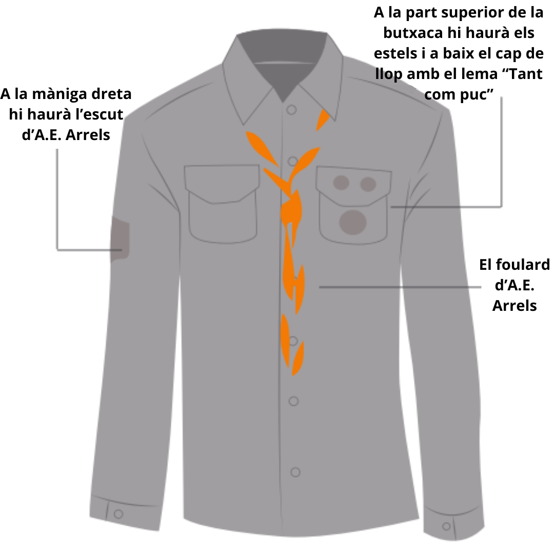 Ens reconeixereu perquè portem una camisa de color grisa i per primer cop el fulard de l’agrupament! Aquesta peça simbolitza que formem part de l’agrupament i ens fa molta il·lusió. La nostra salutació escolta la fem separant els dits índex i mitjà de la mà dreta.